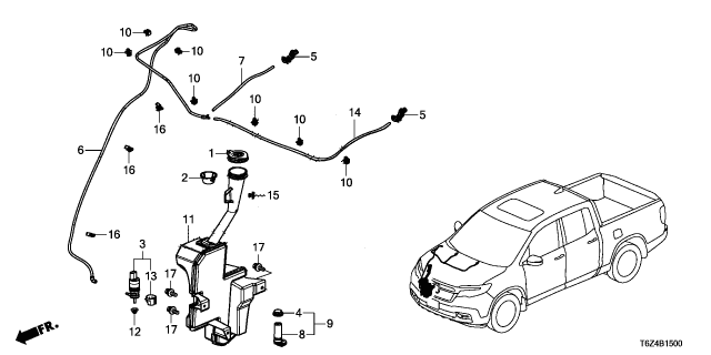 Honda Ridgeline parts. Parts like Windshield Washer are shipped directly from authorized Honda dealers and backed by the manufacturer's warranty. Parts fit for the following vehicle options. Body & Trim: 4 Door Black Edition AWD. Emission & Transmission: 9AT.