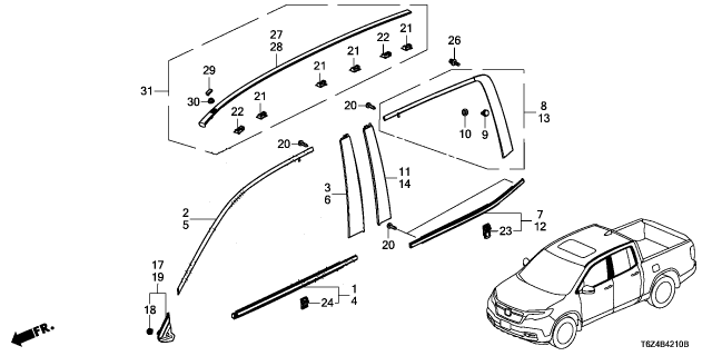 Honda Ridgeline parts. Parts like Molding are shipped directly from authorized Honda dealers and backed by the manufacturer's warranty. Parts fit for the following vehicle options. Body & Trim: 4 Door RTL AWD. Emission & Transmission: 9AT.