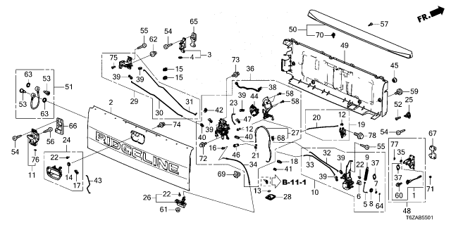 Honda Ridgeline parts. Parts like Tailgate are shipped directly from authorized Honda dealers and backed by the manufacturer's warranty. Parts fit for the following vehicle options. Body & Trim: 4 Door RTL. Emission & Transmission: 9AT.