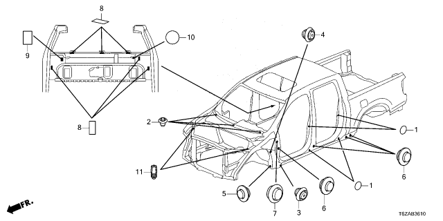 Honda Ridgeline parts. Parts like Grommet (Front) are shipped directly from authorized Honda dealers and backed by the manufacturer's warranty. Parts fit for the following vehicle options. Body & Trim: 4 Door RTL. Emission & Transmission: 9AT.